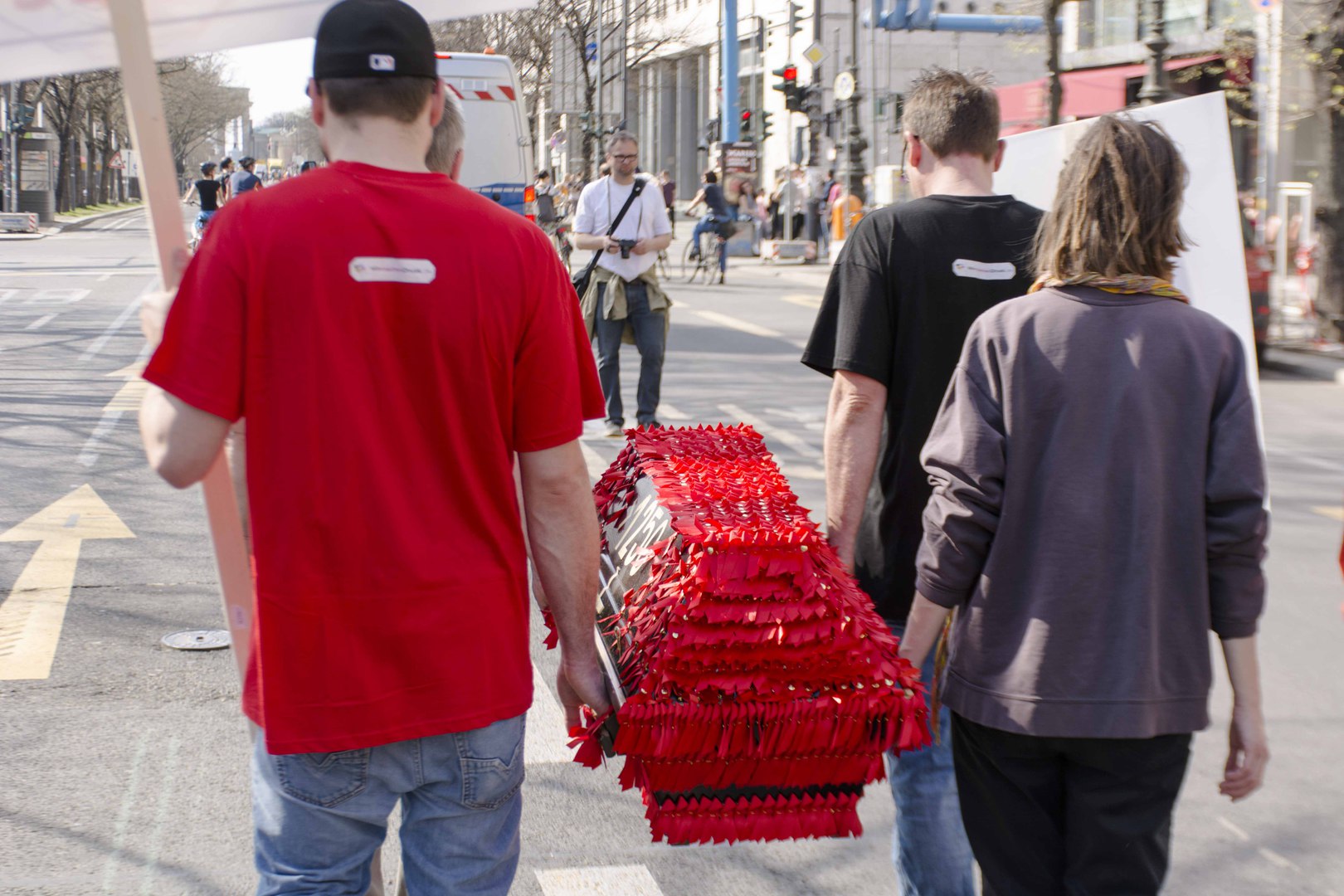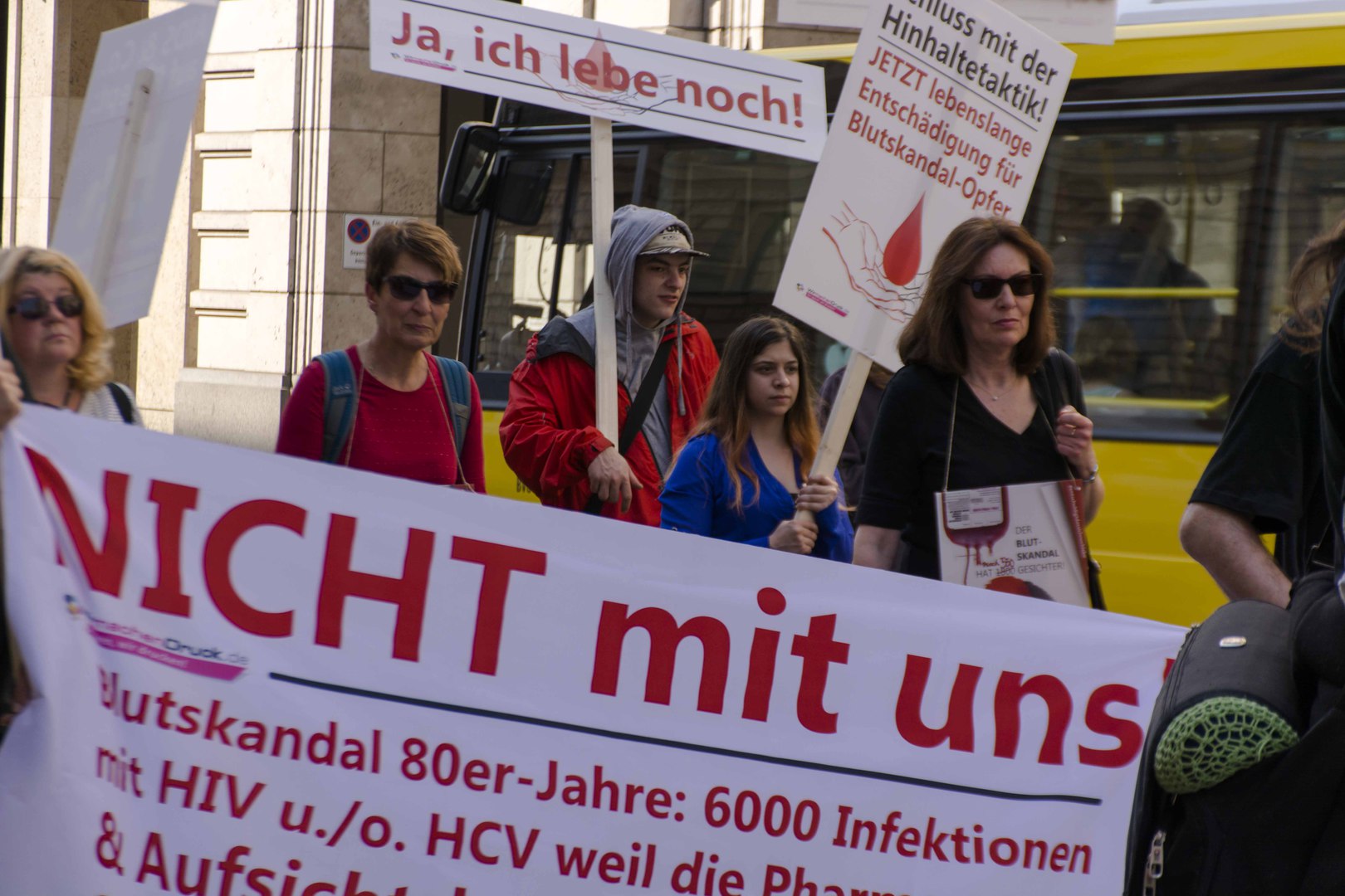 Für die Demo wurde viel Werbung gemacht. Die DAH unterstützte uns, die Berliner Aids-Hilfe mit dem Ulrichs Café, die Zitty Berlin verwies mit einer Anzeige auf den Auftakt ebenso wie die Kobinet Nachrichten, die dpa & weitere. Mit knapp 50 Personen marschierten wir am 01. April bei bestem Sommerwetter durch Berlin & während der Demo konnten Flyer verteilt werden. Die Resonanz auf unseren Demonstrationszug war eindeutig: aufmerksame Betroffenheit. Passanten nahmen haufenweise Infomaterial von unseren fleißigen "Verteilern" entgegen, blieben stehen, redeten, schauten, fotografierten. Genau das, was wir erreichen wollten. Während dem gesamten Aufzug wurde das Megaphon bedient, wurden Informationen ständig & in Wiederholung gegenüber der Öffentlichkeit artikuliert. Die Polizei "bahnte" uns den Weg & dank der gemieteten Rollstühle konnten sich müde Füße zwischenzeitlich erholen. Unsere Plakate, der Sarg & die Shirts unterstützten ein prägnantes Gesamtkonzept, das wohl in einigen Köpfen ankam & hängenblieb.